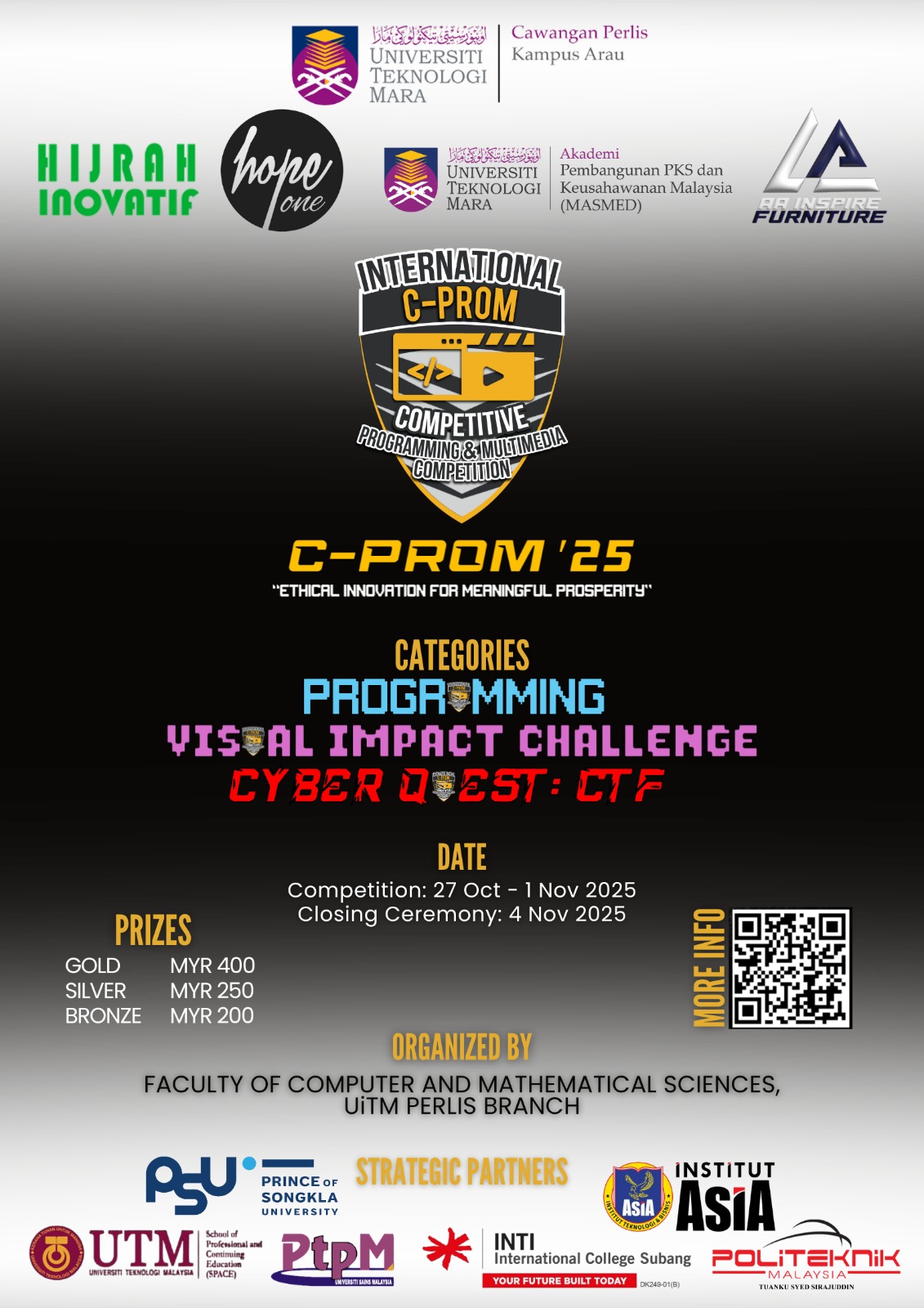 The International Competitive Programming & Multimedia Competition (International C-PROM) is an esteemed annual event organized by the Department of Computer Science, Faculty of Computer and Mathematical Sciences, Universiti Teknologi MARA (UiTM), Perlis Branch. Designed to showcase the creativity and technical skills of students in programming and multimedia, the competition is open to both local and international students from universities and institutions of higher learning.